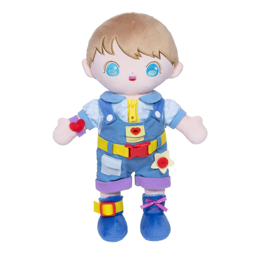 2-PIECE DOLL SET - This Buckle N' Learn Montessori toy set comes with one soft plush doll with an embroidered face and a blue multicolored sensory outfit.