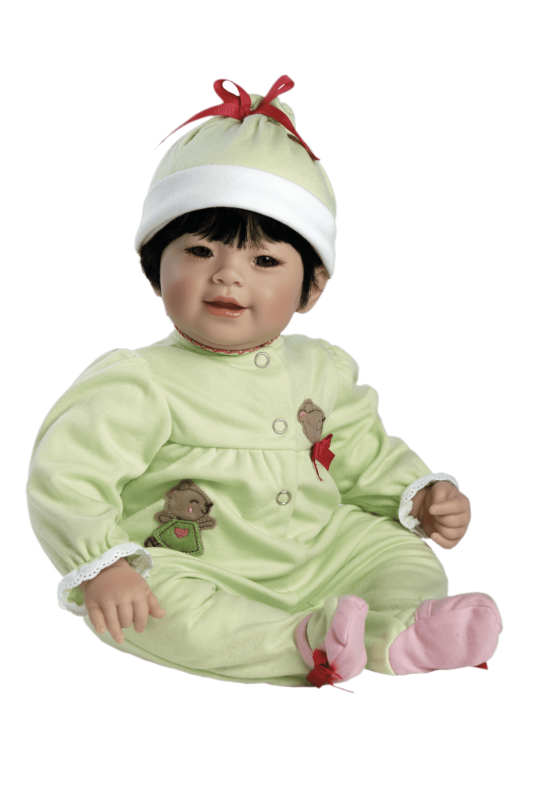 A pretty baby, so warm and cuddly in one piece lime green pajamas and nighty cap. The appliquéd felt bears dancing on her PJ’s make her giggle. Getting drowsy she stretches her little toes inside her faux ballerina slippers. Safe and secure in mommy’s arms she is off to dreamland.
