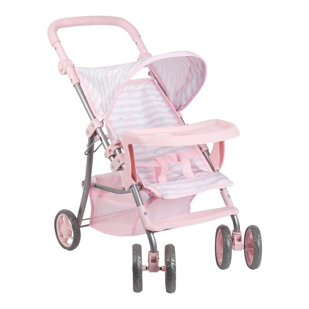 MADE FOR LITTLE PARENTS - This Adora baby doll stroller includes one fully assembled pastel heart-print doll stroller with an adjustable sun cover and doll accessory storage.