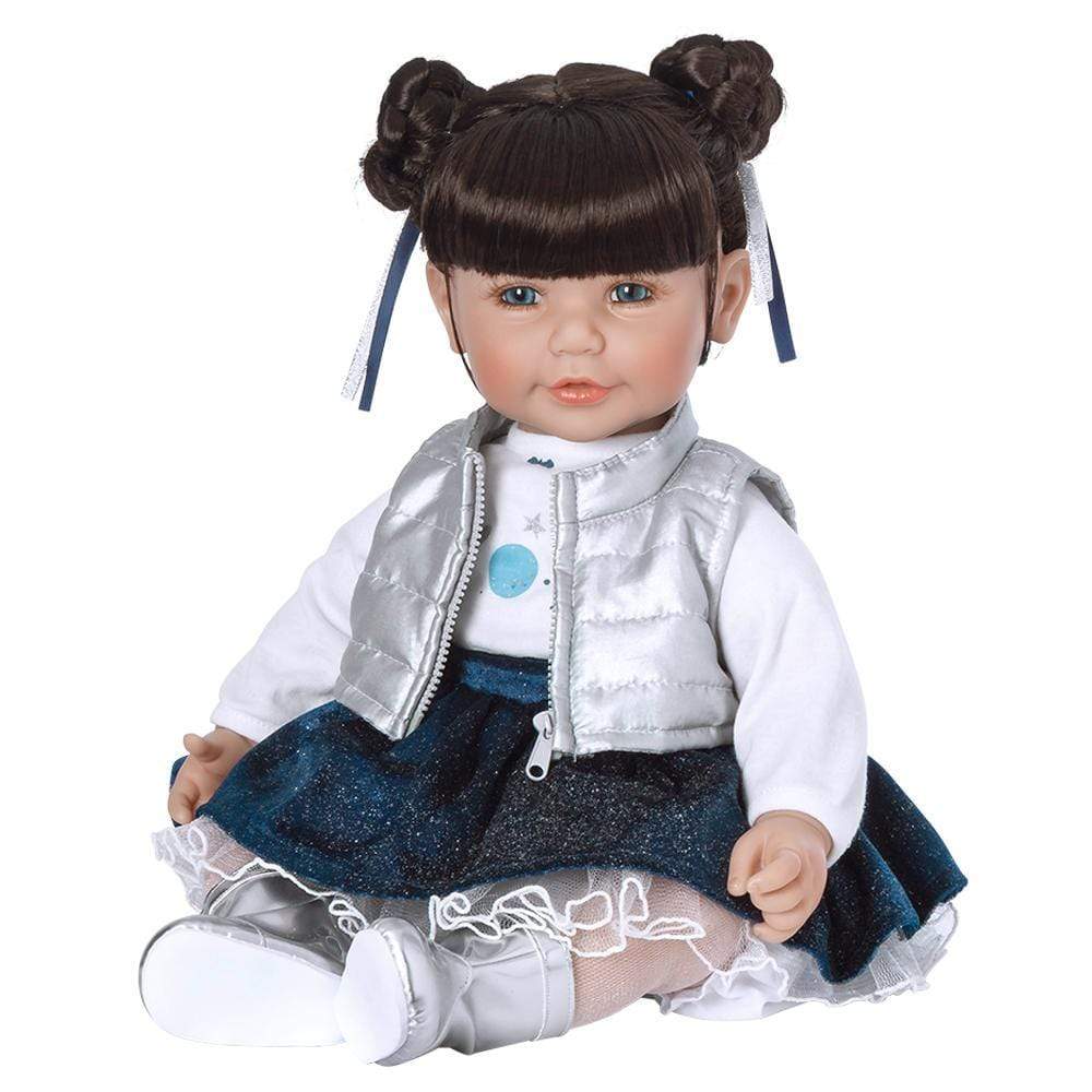 Outta This World and the perfect companion and friend, ToddlerTime Doll Cosmic Girl is ready to play and take orbit space…with you! This 20-inch baby doll is such a cosmic beauty, comes dressed in a white long-sleeved orbit t-shirt under a silver puffy vest with zip front, sparkling midnight blue skirt with a layer of scallop edge ruffles and white pantaloons. Her silver books are out of this world and her lovely double braided space buns are accented with blue and silver ribbons. Truly ADORAble as she is, Cosmic Girl's sleek dark brown hair with bangs compliment her beautiful blue eyes and sweet hand-painted rosy cheeks and baby lips. She also comes with a traditional diaper for a more realistic play! Her outfit is removable, so you can change & dress her up with our available ToddlerTime Fashions.
